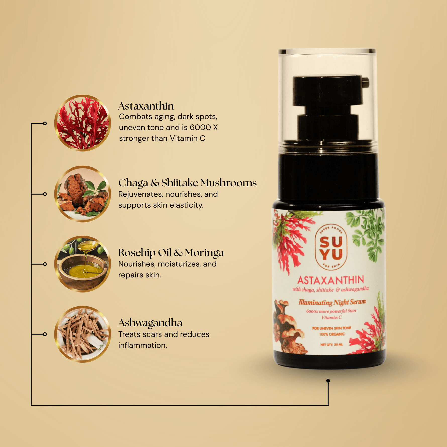 Description: Immerse yourself in the transformative elixir of our Night Serum—a potent concoction supercharged with the greatest of superfoods like Astaxanthin (powerhouse of antioxidants that is 6000 times more powerful than Vitamin C and 100 times more powerful than Vitamin E) Chaga Mushroom, Shiitake Mushroom, and Ashwagandha. This extraordinary blend is more than a serum; it’s a warrior potion, meticulously crafted to awaken and fortify your skin’s natural resilience. Let the harmonious synergy of these powerful ingredients elevate your nighttime skincare ritual, unlocking the secrets of radiant, revitalized, and fortified skin.