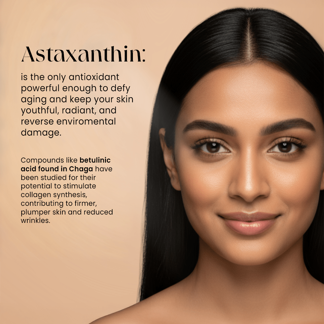 As a potent antioxidant, Astaxanthin fights free radicals and safeguards skin against premature aging. Its anti-inflammatory properties help calm and soothe irritated skin. Moreover, this super algae helps combat hyperpigmentation, stimulate collagen production, support skin structure, and much more.