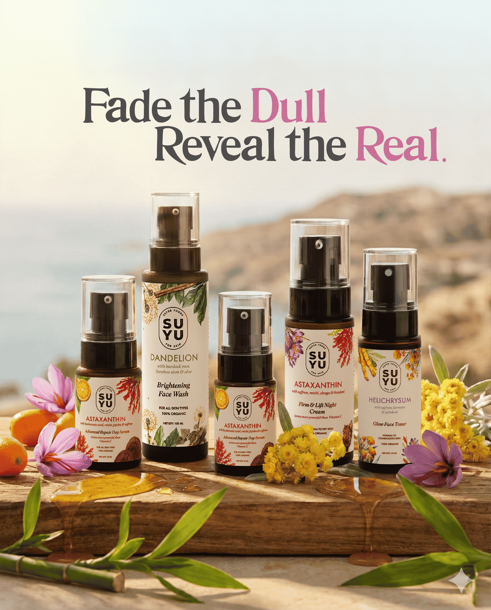 Astaxanthin, THE HERO of antioxidants, is more powerful than Vitamin C by 6000 times, helps combat free radicals, reduces pigmentation, and promotes an even skin tone. Reishi helps diminish fine lines and wrinkles, contributing to a more youthful appearance. Its natural soothing and anti-inflammatory qualities make it effective in calming redness and irritation, promoting a balanced and comfortable skin texture. Chaga Mushroom acts as a healing agent, soothing skin irritation and sunburn. Vitamin E, almond oil, and Brahmi provide nourishment, while aloe vera ensures hydration.